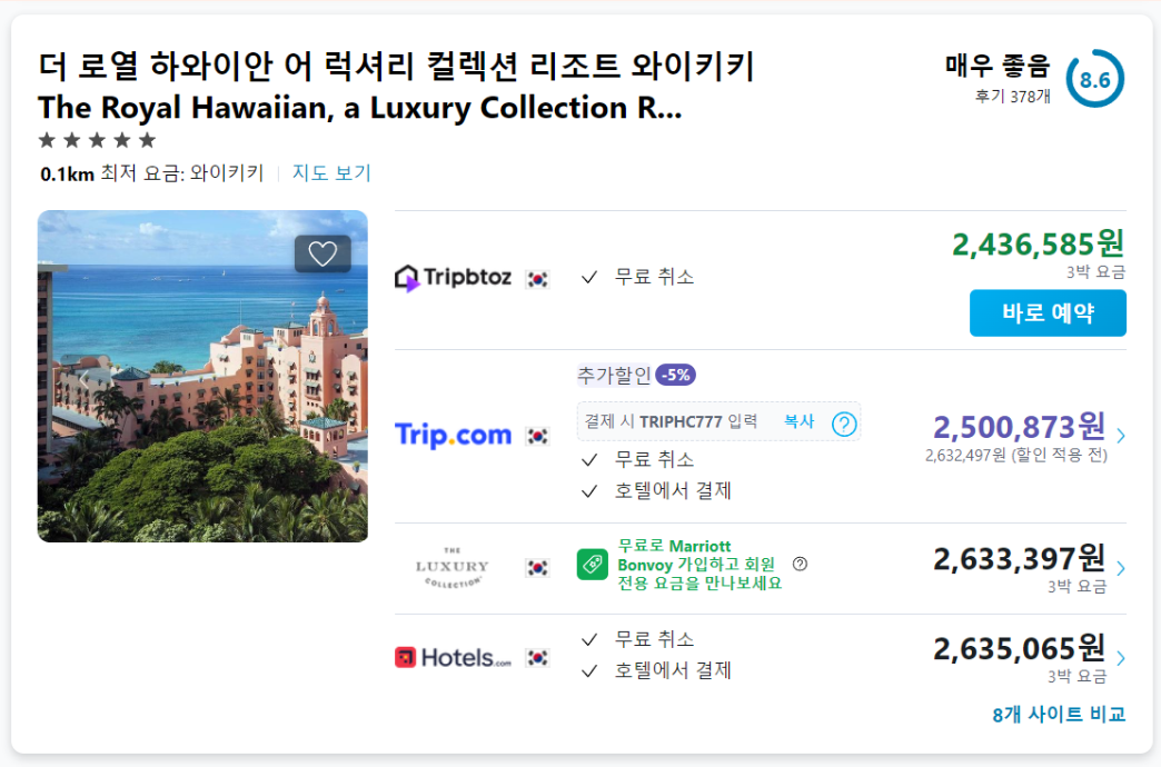 와이키키 비치코머 바이 아웃리거 호텔은 트립닷컴이 세금포함 1,088,718원으로, 가격비교사이트의 1,137,658원보다 더 저렴하다. 모두 리조트피는 제외한 요금이다.