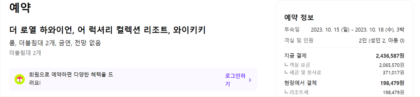 트립닷컴 로그인 전에는 1박 당 720,818원 이었던 객실이, 로그인 후에는 568,219원으로 바뀌었다. 참고로 트립닷컴은 회원 가입을 하면 바로 실버회원이 된다. 회원 전용 요금의 경우 호텔 공식사이트에서 최저가 매치를 해 주지 않기 때문에 가능한 상황이다. 아래의 하얏트 리젠시 와이키키 호텔도 로그인을 하니 2.5만원 정도 더 저렴해졌다. 다만, 항상 모든 곳이 큰 할인율이 적용되는 건 아니고, 그때그때의 프로모션 마다 다르다.