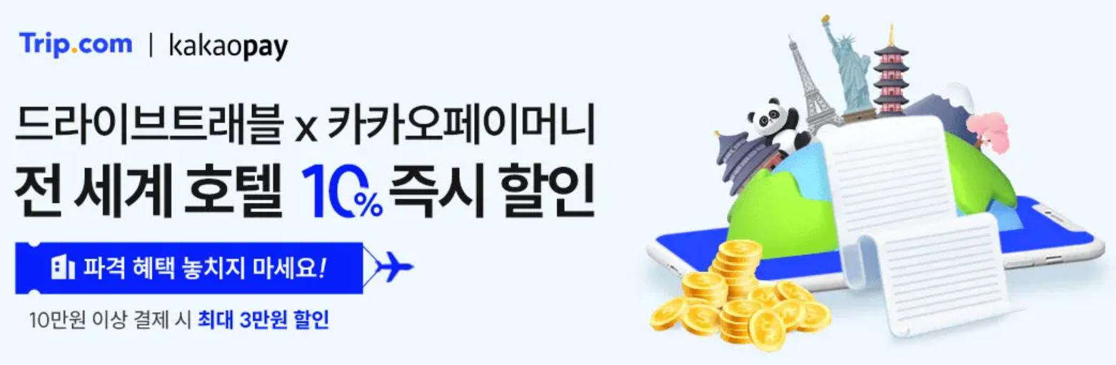 트립닷컴에서 새롭게 프로모션이 나왔다. 이번에는 할인코드가 아니라 전용링크를 통해서 이동할 경우 자동으로 10% 할인이 적용된다. 이 프로모션은 드라이브트래블x카카페이머니 프로모션이기 때문에, 10% 즉시할인은 카카오페이머니(카드 사용 불가)를 사용해야만 할인이 가능하다. 10%는 최대 3만원까지 할인 되므로, 30만원 전후의 호텔을 예약할 때 최적의 가성비다.