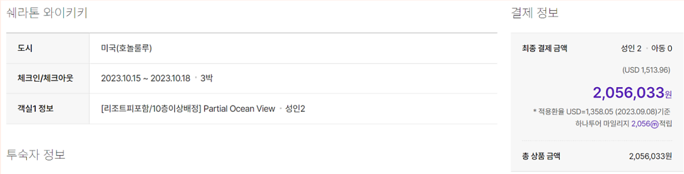 하나투어에서는 시티뷰 객실이 리조트피 및 세금을 포함해 2,000,747원이다. 금액적으로는 트립닷컴의 파샬 오션뷰보다 비싼 금액이다.