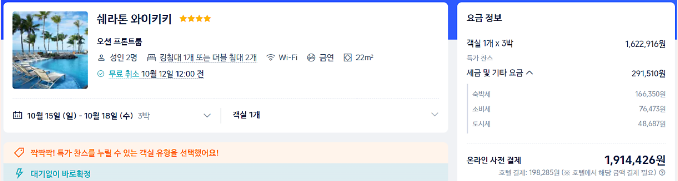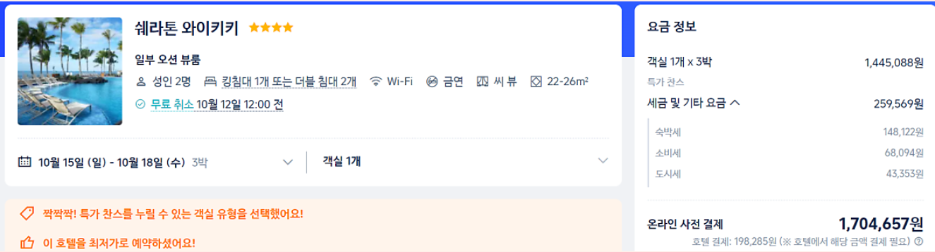 다음에는 호텔 가격비교사이트 중 하나인 호텔스컴바인에서 동일하게 10월 15일~18일 쉐라톤 와이키키를 검색해 보았다.