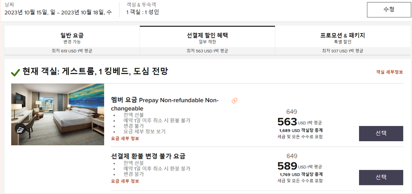 메리어트 공식 홈페이지의 요금은 어떨까? 트립닷컴의 요금이 취소 가능요금이데 반해, 메리어트 공식홈페이지의 가장 저렴한 요금(시티뷰)의 경우 환불 불가인데다가 세금 및 리조트피까지 포함해서 $1,689 나 된다. 한화로 치면 약 2,253,126원. 트립닷컴의 오션프론트룸보다 더 비싸다.