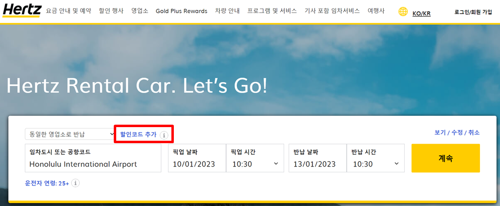 위 허츠 공식 홈페이지 링크를 통해서 이동 후, 호놀룰루 국제공항(HNL)으로 1월 10일 10:30 ~ 1월 13일 10:30 으로 검색을 해 보았다. 또한, 할인코드라는 것이 있는데, 클릭해서 할인코드 및 요금코드를 입력하면 추가 10% 할인을 받을 수 있다. 골드회원일 경우 골드회원으로 로그인 후 진행하면 된다.