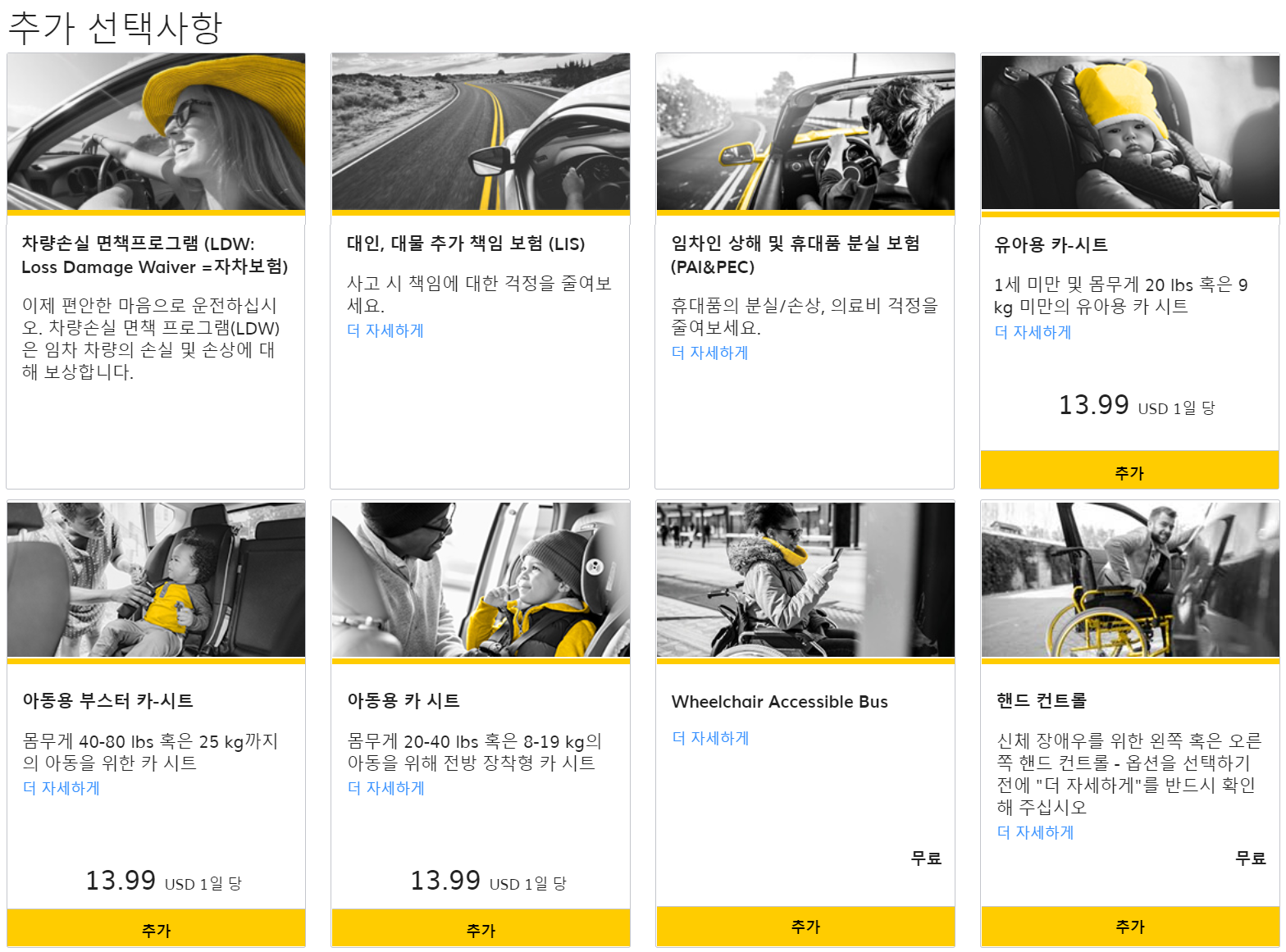 다음에는 추가 선택사항이다. 여기서는 ASX 코드로 자차(LDW), 대인/대물(LIS), 자손(PAI&PEC)을 포함했기 때문에 아래에 추가라는 항목이 마오지 않았다. 그 외에는 사전에 특별히 추가할 것은 없으나, 아동용 카시트가 필요할 경우, 사전에 요청하는 것이 가능하다. 참고로 골드회원의 경우 일반회원보다 카시트 요금이 저렴하다.