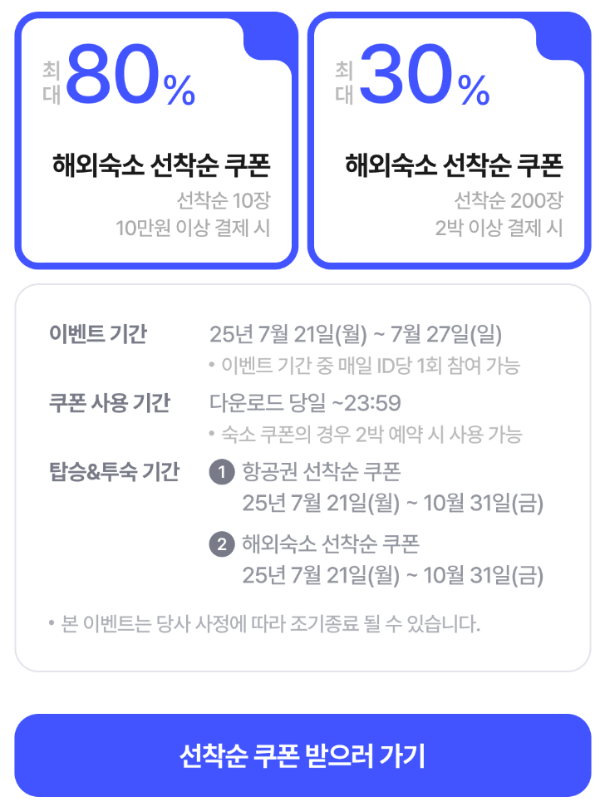 경쟁이 다소 심하기는 하지만, 그래도 해외숙소 선착순 쿠폰은 한 번 노려볼만한 기획전 혜택이다. 하루 선착순 10장 및 200장만 가능하기 때문에 시간을 딱 맞춰서 잘 노려보는 것을 추천한다.