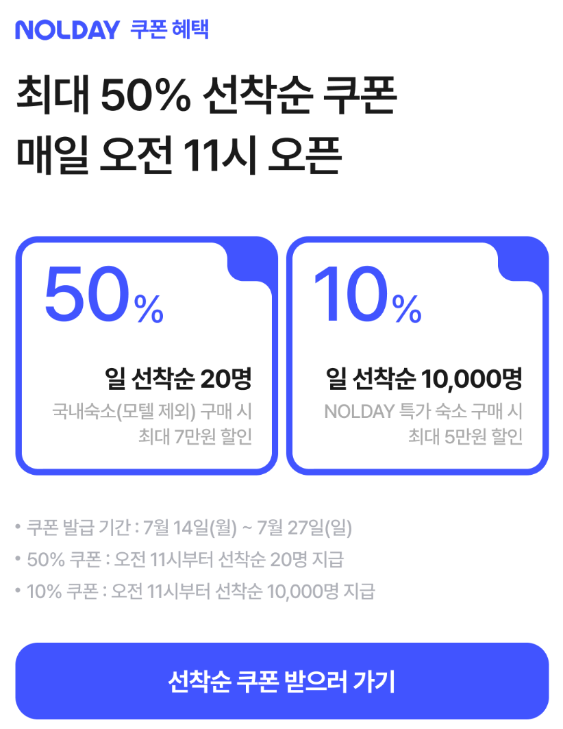 현재 NOLDAY 기획전 행사가 진행중에 있으며, 7월 27일까지 매일 오전 11시에 50% 및 10% 쿠폰을 선착순으로 제공하고 있다. 물론, 선착순 혜택을 받지 못했다고 하더라도, 기본적으로 제공하는 할인쿠폰 및 각종 카드와 페이 연계 할인이 있기 때문에 국내 중소규모 숙소들은 야놀자가 최저가인 경우가 꽤 많다.